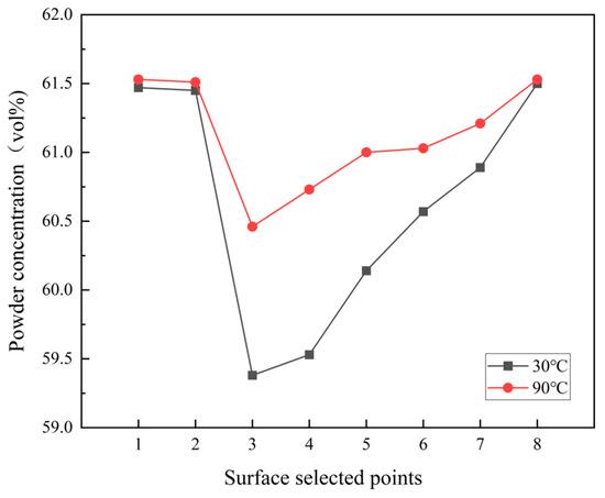As illustrated in Figure 11, the variation curves of powder volume concentration corresponding to eight reference points at different mold temperatures demonstrate a trend of decreasing and then increasing. Point 2 is located at the gate, where the powder concentration is relatively high due to the replenishment effect. Conversely, point 3 exhibits the lowest powder concentration, indicative of a pronounced separation of the two phases and an accumulation of binder. As the filling progresses, the temperature in the mold cavity becomes increasingly uniform, the viscosity undergoes minimal changes, and the powder and binder undergo re-combination. This is evidenced by the subsequent increase at the later stages. It is noteworthy that the powder concentration at point 3, when the mold temperature is 30 °C, is remarkably low, indicating a more pronounced separation. This observation suggests that elevated mold temperatures facilitate more uniform distribution.