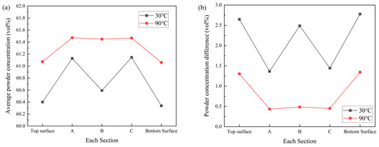 The average powder volume concentration, as well as the difference in powder concentration, were obtained from the maximum and minimum values of each section, as illustrated in Figure 12. The average concentration of section A and C is the highest, and exceeds that of section B. This may be due to the fact that the temperature of the center layer is the highest, which leads to low viscosity and relative separation of powder, as wells as binder flow rate imbalance during the flow process. Furthermore, the concentration difference in the section with the higher average concentration is also smaller. It can be seen that both the value and fluctuation of the powder concentration difference in each section at a mold temperature of 90 °C are smaller, indicating that the powder distribution of the parts as a whole is more uniform.