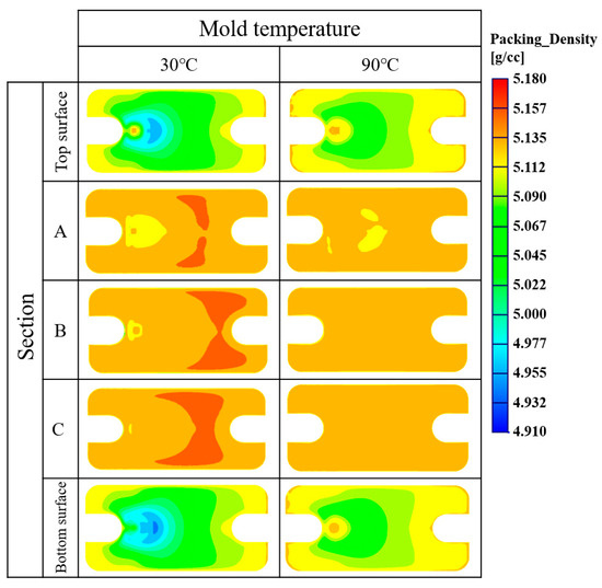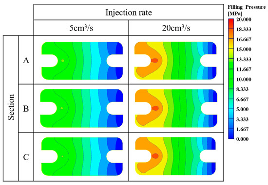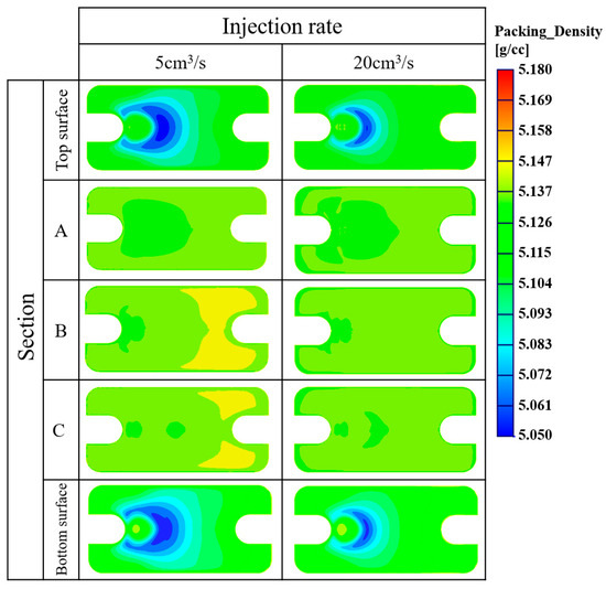 Figure 16 illustrates the pressure field distribution of section A, B, and C at different injection speeds. As the injection speed increases, the required injection pressure for the melt flow also increases. Therefore, the pressure variation inside the mold cavity is more pronounced and densely distributed at 20 cm3/s. In addition, the higher shear rate of the melt at the gate may lead to an increase in flow resistance and subsequently create a larger pressure gradient. This can cause a sudden rise in local pressure, leading to the formation of defects. Density distribution can be used to evaluate whether the pressure at this point will impact the final product.