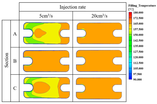Figure 14 displays the temperature field distribution of sections A, B, and C under different injection speeds. When the injection speed is 5 cm3/s, the temperature decreases and then increases along the direction to the right, away from the gate, with the same changes in the direction to the left. The overall gradient is relatively large. However, when the injection speed rises to 20 cm3/s, the temperature distribution across all three layers becomes more uniform with almost no gradient. This is because the increased friction within the melt and against the mold wall generates more heat, resulting in a smaller temperature difference within the mold cavity. In addition, as the injection speed increases, the melt fills the mold cavity more rapidly, reducing heat dissipation and preventing uneven cooling during the filling stage.