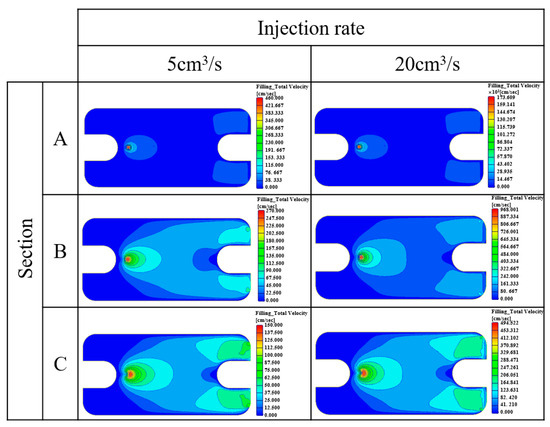 Figure 15 shows the velocity field distributions of section A, B, and C at different injection speeds. Because of the large gap between the velocity fields, the respective scale bar is chosen to observe the pattern clearly. It is worth noting that the velocity fields distribution remains consistent. There is a phenomenon of dense contour lines and high gradients near the gate, uniform velocity in the middle, and an increase in velocity towards the tail, which has been explained in the previous section. The velocity field at 20 cm3/s also exhibits a significant gradient, unlike its temperature field, which is very uniform. This is because the melt-flow process affects not only the temperature, but also the shape of the mold cavity, the length of the part, flow resistance and other factors. The velocity field distribution pattern remains unchanged under the comprehensive influence of these factors, with only numerical differences.