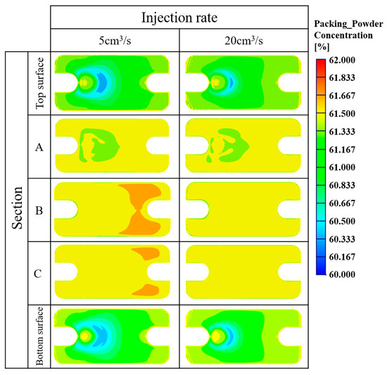 Figure 17 displays the distribution of powder volume concentration of the top and bottom surfaces of the part and sections A, B, and C at different injection speeds. At the injection speed of 5 cm3/s, powder still accumulates at the gate, forming binder-rich areas, and increases towards the rear of the mold cavity. However, when the injection speed reaches 20 cm3/s, the separation near the gate decreases, and the accumulation phenomenon at the rear end becomes less prominent. This is because of the melt temperature, which is the dominant factor influencing melt viscosity. The overall flow process remains stable due to the uniform and high temperature field, resulting in minimal changes in viscosity. The gentle fluctuation in viscosity contributes to maintaining the binding capability between the powder and binder, promoting even distribution. This significantly alleviates separation phenomena.