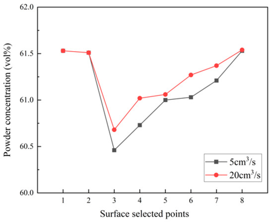 Figure 18 shows the variation curves of powder volume concentration on the top surface of the parts at different injection rates. The figure indicates a tendency for the powder distribution to initially decrease, followed by an increase, suggesting that alterations in the injection rate will not significantly impact the powder distribution trend on the upper surface. The optimized rate (20 cm3/s) effectively reduces the distribution fluctuation of the powder concentration, thereby suggesting that increasing the injection rate is conducive to achieving powder homogeneity.
