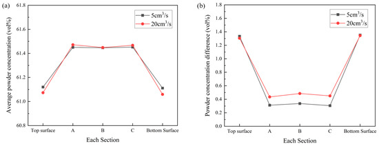 Average powder volume concentration (a) and powder concentration difference (b) of each section at different injection rates.
