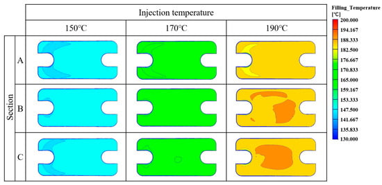 Figure 21 shows the temperature field distributions of section A, B and C at different injection temperatures. As depicted in the figure, the temperature field at 150 °C is relatively uniform. Due to the preferential melt flow towards the left mold wall and subsequent cooling, this area experiences a reduction in temperature with minimal overall temperature gradient, which is advantageous for powder filling. At an injection temperature of 170 °C, the temperature distribution within the mold cavity is also relatively uniform. However, when the injection temperature is increased to 190 °C, high-temperature areas become visible in the center of the B and C slices. This suggests that higher injection temperatures may lead to heat accumulation during the filling process, thereby lowering the viscosity of the melt and facilitating the separation of the two phases.