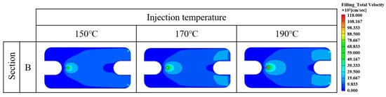 Figure 22 depicts the velocity field distribution at different injection temperatures. Only section B is analyzed here because the three sections’ results are minimally different, as mentioned in the previous two sections. It can be observed that the influence of different injection temperatures on the velocity field is not significant. When injected at a temperature of 150 °C, the velocity contour lines at the gate are relatively dispersed, indicating a more uniform velocity distribution. Additionally, the velocity gradient at the tail decreases due to the small temperature difference shown in the temperature field. This is conducive to reducing the viscosity fluctuation, which is advantageous for alleviating the degree of phase separation. As the injection temperature increases, the gradient at the gate significantly increases and the distribution becomes denser, leading to more serious two-phase separation.