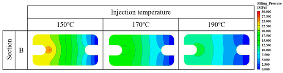 Figure 23 illustrates the pressure field distribution at different injection temperatures. Similarly, only section B is chosen as a reference object in this context. The graph indicates that viscosity decreases and flow resistance reduces with an increase in injection temperature. Therefore, at 190 °C, the pressure field is the most uniform, and the pressure gradient is significantly reduced.