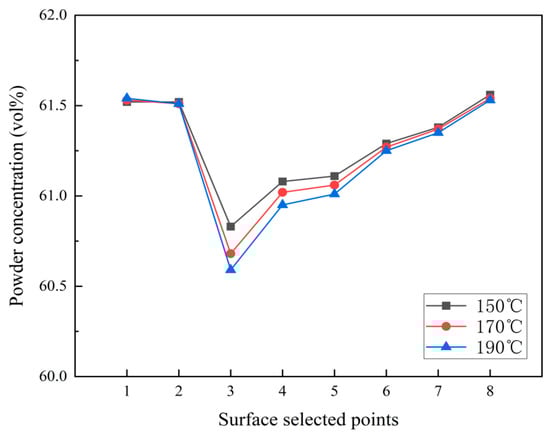 Figure 25 shows the variation curves of powder concentration on the top surface at different injection temperatures and the relative homogeneity. It is evident from the figure that there is no obvious change in the concentration at the remaining points, with the exception of the powder concentration at points 3, 4 and 5. This is due to the fact that this region experiences more severe separation of the two phases, which renders it more sensitive to changes in injection temperature. Furthermore, it is evident from the figure that when the injection temperature is set at 150 °C, the fluctuation values for these three points are notably diminished, thereby suggesting that a reduction in injection temperature is conducive to achieving powder homogeneity.