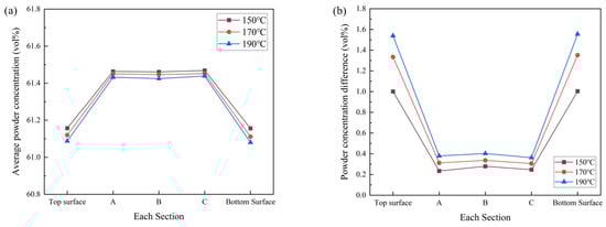 Average powder volume concentration (a) and powder concentration difference (b) of each section at different injection temperatures.