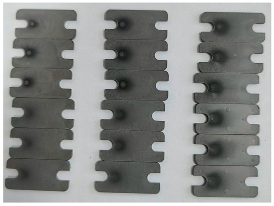 In order to validate the simulation results, a feed consisting of stainless-steel powder was utilized for injection, with the injection temperature varying and all other conditions remaining constant, with the objective of observing the surface of the raw part. As illustrated in Figure 27, the results of the injection experiments are presented, from left to right, at temperatures of 150 °C, 170 °C and 190 °C, respectively. As is evident from the figure, an increase in injection temperature results in a more pronounced separation near the gate (illustrated as the black area, representing the separation area). This observation is in alignment with the simulation results, indicating that elevated injection temperatures hinder the uniform distribution of powder.
