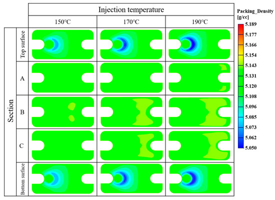 Figure 28 shows the density distribution at different injection temperatures. It correlates with the powder distribution. On the surface, there is a decrease in density near the gate, and the binder-rich areas gradually diminish as the injection temperature decreases. Sections A, B and C also exhibit a more uniform density distribution with decreasing temperature. This is beneficial for decreasing the unevenness in density and improving the appearance quality with mechanical performance near the gate. Hence, it can be concluded that lowering the injection temperature is beneficial for the overall performance of the component.