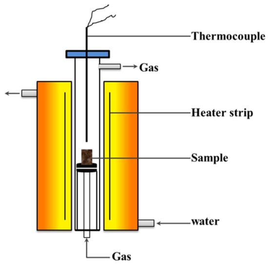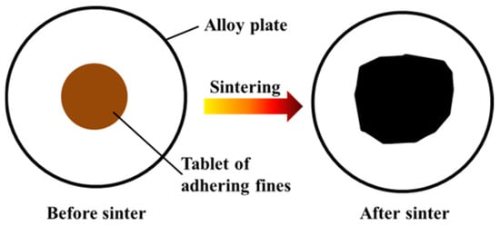 The adhering fines in the strength of the sinter tests (about 0.8 g) were shaped into cylindrical tablet (φ 8 mm × h 6 mm) under a pressure of 15 MPa for approximately 2 min. Figure 4 shows the schematic diagram of fluidity of melt, where the tablet was placed on a 50 mm diameter of an iron–chromium–aluminum alloy. The equipment, temperature, and atmosphere were identical to the strength of the sinter tests. Fluidity of Melt Index (FMI) was defined by the area of the melt before and after sintering tests [59,60]. The FMI was calculated by Equation (1) and used to evaluate the bonding range of the original melt.