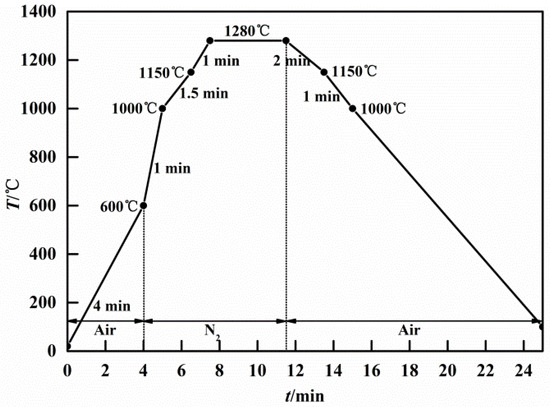 The basicity of sinter is usually 1.5~2.5, while the basicity of iron ore is very low, usually less than 0.1 [13,52,53]. To increase the basicity of the sintering mixtures, some basic fluxes such as quicklime, limestone, and dolomite are usually added to the mixed iron ores. Since the size of those fluxes is small, they will mix with the iron ore fines (less than 1 mm) to form a high basicity of adhering fines. During the granulating process, the core ores (more than 1 mm) were coated with adhering fines [22,54,55,56]. Ore-A~Ore-E was screened to be 1.8 to 2.0 mm as core ores, while the mixture of Ore-F and CaO pure reagents acted as adhering fines. The mass fractions of the adhering fines are usually between 20% and 50%. The bonding phase is the melting formed by the adhering fines at high temperatures. To form a more bonding phase, the mass ratio of the cores to the adhering fines was 1.5 in this paper. They were granulated in a disk pelletizer to be quasi-particles (between 2.0 and 2.5 mm), which were sintered in micro-sinter equipment. The schematic diagram of the strength of the sinter is shown in Figure 1. Figure 2 shows the schematic representation of the micro-sinter equipment, and Figure 3 shows the change in temperature and atmosphere during the strength of the sinter test. During the actual iron ore sintering process, the coke breezes in the sintering mixture begin to burn over 600 °C, which leads to a decrease in the volume fraction of oxygen in the sintered bed. After the coke breezes burn off, the atmosphere returns to the air. Since there were no coke breezes in the experiment materials in this study, the energy was supplied by electric heating. To simulate the actual iron ore sintering process, the atmosphere was set as nitrogen between 600 °C and the highest temperature, and air in other stages. The systems of experimental temperature and atmosphere in the paper were referred to the method by Wu [27,31,41,57]. The experimental conditions of all schemes are shown in Table 2. The sintering parameters of the base scheme were set as follows: core ore was Ore-A, ore type of adhering fine was Ore-F, the binary basicity of adhering fine was 7.0, the maximum sintering temperature was 1280 °C, and the holding time over 1150 °C was 7.0 min. In this paper, when the binary basicity of the sinter is 1.5, 2.0, and 2.5 for B1, base, and B2 schemes, respectively, it can be calculated that the binary basicity of the adhering fines is about 5.0, 7.0, and 9.0. Based on the base scheme, the influences of maximum sintering temperature, binary basicity of adhering fines, and type of core ores on the strength of the sinter were investigated. According to ISO 8263: 1992 (Iron ore fines—method for presentation of the results of sintering tests), sinters with a size larger than 5 mm were considered qualified products, while sinters with a size smaller than 5 mm were sintered again as raw materials. After sintering, the original weight of the sintered body was measured first, and then free fell the sintered body from 2 m high down to a steel plate with a thickness of 5 mm and screened the pieces with a 5 mm perforated screen. The Shatter Index (SI) of sinter was defined as the mass factions of the sinter pieces above 5 mm after five fell times and used to evaluate the yield of sinter products [58].