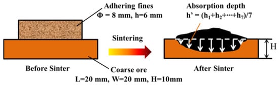 To simulate the reaction behavior between the original melts and the dense core ores, some large and dense iron ore particles with a size of more than 30 mm were directly selected from the raw materials. Then, they were cut into a cube (H 20 mm × W 20 mm × H 10 mm) and polished its surface with 60# emery. Then, 0.8 g of adhering fines were shaped into a cylindrical tablet (φ 8 mm × h 6 mm), which was placed on the surface of the above-mentioned polished cube. Then, they were sintered in the micro-sinter equipment. The equipment, temperature, and atmosphere were identical to the strength of the sinter tests. After sintering, the polished surface in the vertical direction of samples was observed by the microscope and the absorption depths h1 to h7 were measured to calculate the average melt absorption depth h′. Then, the ratio of h′/H was defined as the Melt Absorption Index (MAI) [31], which represented the melt absorbability of core ores. It can be used to indirectly evaluate the effective bonding phase. Figure 5 shows the schematic diagram of the melt absorption process.