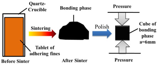 Adhering fines to the strength of the sinter tests (about 2.4 g) were shaped into a cylindrical tablet (φ 8 mm × h 20 mm) under a pressure of 15 MPa for approximately 2 min, then sintered in micro-sinter equipment. The equipment, the temperature, and the atmosphere were like those in the strength of the sinter tests. After sintering, the bonding phase was polished into a cube (a = 6 mm), and then the compressive strength of the bonding phase was measured by a compressive strength tester. Figure 6 shows the schematic illustration of the strength of the bonding phase. Compressive Strength (CS) was adopted to characterize the strength of the bonding phase, which was the combined strength of the mineral components and pores in the bonding phase [41].