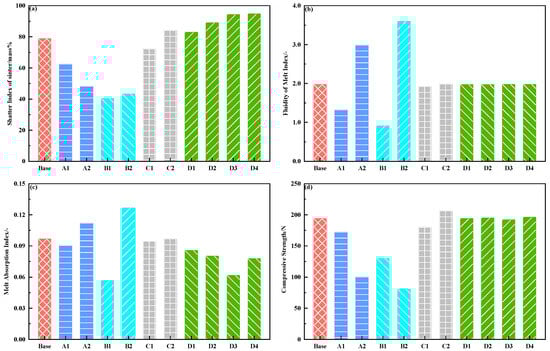 Results of high-temperature characteristics such as shatter index of sinter (a), fluidity of melt index (b), melt adsorption index (c), and compressive strength of the bonding phases (d) at different sintering parameters.