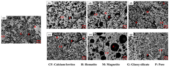 Morphology of the bonding phase at different sintering parameters: (a) Base scheme-1280 °C; (b) A1 scheme-1240 °C; (c) A2 scheme-1320 °C; (d) B1 scheme-basicity of five; (e) B2 scheme-basicity of nine; (f) C1 scheme-6 min; (g) C2 scheme-9 min.