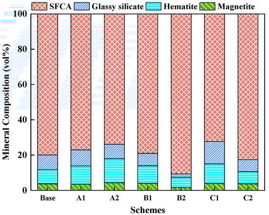 In addition, quantitative textural data were collected using point counting following the mineral classification scheme detailed in Honeyands [53,64]. Figure 9 shows the mineral composition of the bonding phase at different sintering parameters. When the maximum sintering temperature increased from 1240 °C to 1280 °C, the SFCA contents increased and pore decreased, resulting in the strength of the bonding phase increased. Moreover, the SFCA content decreased at 1320 °C. The formed melts were more fluid, which increased the expulsion of bubbles from the melt before solidification, and SFCA was decomposed to hematite, resulting in the strength of the bonding phase decreasing significantly [50,51,53,65]. At the same time, with increasing the binary basicity of adhering fines, the SFCA content increased while the hematite and magnetite contents decreased. However, since there were many large pores at the bonding phases with the binary basicity of five and nine, the strength of the bonding phase decreased sharply. In addition, as the holding time over 1150 °C was increased, the SFCA content increased, while both the contents of glassy silicate and pores decreased, which increased the strength of the bonding phase.