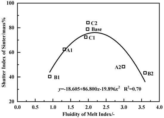 The quantity of the bonding phase was influenced by the original melt and the melt absorbability of core ore. To clarify the influence of the original melt on the strength of the sinter, the relationship between them was analyzed and the result is shown in Figure 10. By increasing the fluidity of the original melt, the strength of the sinter increased first and then decreased, and it reached the maximum value when the fluidity of original melt was about 2.15. When the fluidity of the original melt was excessively over 3.0 (e.g., scheme A2 and B2), the strength of the sinter was lower than 40%. Although the melt could effectively bond the un-melt core ores, the strength of the bonding phase was low, which also finally led to a decrease in the strength of the sinter [6]. Furthermore, the influence of the strength of the bonding phase on the strength of the sinter is discussed in the next section.