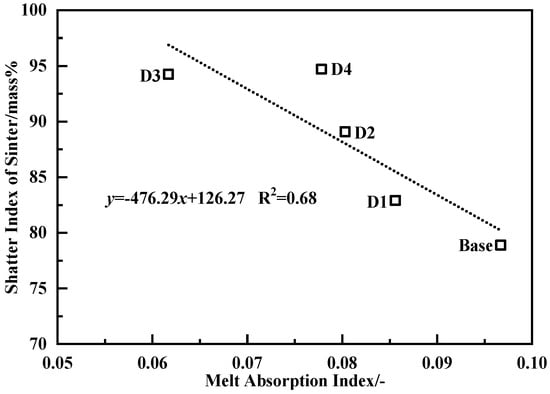 Figure 11 shows the relationship between the melt absorbability of core ores and the strength of the sinter. As the MAIs of core ores increased, the strength of the sinter decreased linearly. Due to the formation of the secondary bonding phases between the original melts and core ores, the quantity of the effective bonding phase decreased by the higher MAI of core ore decreased. The iron oxide, SiO2, and Al2O3 compositions of core ores fused into the secondary bonding phase, which resulted in its lower fluidity. The influencing factors of the melt absorbability of core ores were iron mineral type, and the gangue compositions, such as SiO2 or Al2O3. They inhibited melt penetration depth, and the impact of Al2O3 content was larger [27,31,45,66,67,68,69]. These factors weakened the effective bonding zone of the bonding phase, which resulted in decreasing the strength of the sinter.