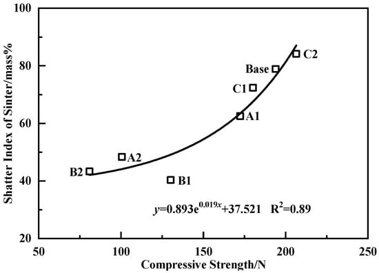 To clarify the influence of the quality of the bonding phase on the strength of the sinter, the relationship between the strength of the bonding phase and the strength of the sinter was analyzed, and the result is shown in Figure 12. It indicated that there was an exponential relationship between the strength of the sinter and the strength of the bonding phase. When the binary basicity of adhering fines was 5.0, the strength of the bonding phase was higher. However, the fluidity of the original melt was insufficient, which led to bonding weakly among the un-melted core ores. Sufficient melts were an indispensable condition to ensure the high strength of the sinter [50]. Nevertheless, when the un-melted core ores were effectively bonded, the strength of the bonding phase was the main influencing factor in the strength of the sinter [26,31]. In the A2 and B2 schemes, though the fluidity of the original melt was great, the strength of the bonding phase was low, which led to a decrease in the strength of the sinter.