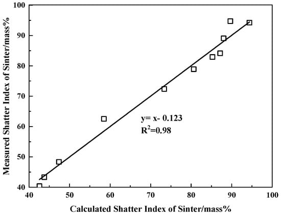 Due to the small number of samples in this paper, it is difficult to cover the entire range of MAI, FMI, and CS. Therefore, Equation (2) is only applicable to FMI, MAI, and CS in the range of 0.90~3.00, 0.06~0.13, and 80~206 N, respectively, which has some limitations. According to Equation (2), we can obtain the calculated SI. The fitting results of the calculated and measured SI are shown in Figure 13. It suggests that the calculated and measured SI is in good agreement. The relationship between SI and FMI, MAI, and CS can be quantified by Equation (2). It indicates there is a negative correlation between the melt absorbability of core ore and the strength of the sinter. However, both the strength of the bonding phase and the fluidity of the original melt have a negative correlation with the strength of the sinter. Equation (3) shows that the regression coefficients of three independent variables (CS, FMI, and MAI) were 1.094, 0.739, and −0.422, respectively. It suggests that the strength of the bonding phase was the main influencing factor in the strength of the sinter. Moreover, compared to the melt absorbability of core ores, the fluidity of the original melts had a greater influence on the strength of the sinter.