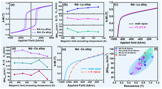 (a) The hysteresis loops of the Nd-La and Nd-Ce alloys; (b) the magnetic properties of the Nd-La alloy as a function of magnetic annealing temperatures; (c) the demagnetization curves of the melt-spun and magnetic field-annealed Nd-La alloy at 573 K; (d) the magnetic properties of the Nd-Ce alloy as a function of magnetic annealing temperatures; (e) the demagnetization curves of the melt-spun and magnetic field-annealed Nd-Ce alloy at 723 K; and (f) the comparison of Br and (BH)max, where red pentagrams represent alloys assessed in this study.