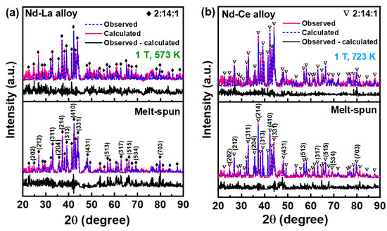 Figure 2 shows the XRD patterns of the melt-spun and magnetic field-annealed Nd-La and Nd-Ce alloys. The single Nd2Fe14B (2:14:1) phase is observed in the studied alloys, indicating that the phase constitution is not changed after magnetic field annealing. Nd2Fe14B shows a tetragonal structure (space group P42/mnm, a = 8.80 Å, c = 12.20 Å) [6]. The lattice parameter (a, c) is obtained by Le Bail refinement. The respective value of a and c of the melt-spun Nd-La alloy is 8.79 Å and 12.21 Å and that of the melt-spun Nd-Ce alloy is 8.80 Å and 12.21 Å. It indicates that the partial substitution of Nd by La or Ce has a marginal effect on the lattice parameters of Nd2Fe14B phase. After magnetic field annealing, the lattice parameters of the Nd-La alloy (a = 8.78 Å, c = 12.19 Å) and Nd-Ce alloy (a = 8.81 Å, c = 12.20 Å) both show a slight change when compared with those of the melt-spun Nd-La and Nd-Ce alloys. Using the Scherrer formula [45], the respective average grain sizes of the melt-spun and magnetic field-annealed Nd-La alloy are approximately 24 nm and 32 nm. In the melt-spun and magnetic field-annealed Nd-Ce alloy, they are estimated to be 44 nm and 34 nm. It suggests that the grain size in the Nd-La alloy is increased, while it is reduced in the Nd-Ce alloy after magnetic field annealing.