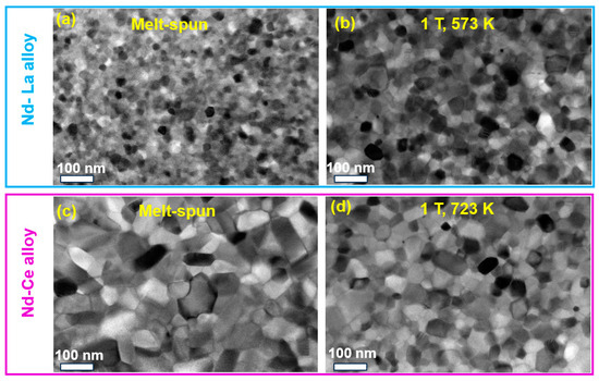 The TEM images of the melt-spun and magnetic field-annealed alloys: (a,b) the Nd-La alloy and (c,d) the Nd-Ce alloy.