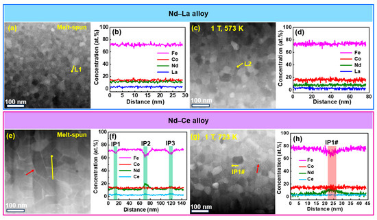 (a,b) The HAADF image and line scan of the melt-spun Nd-La alloy; (c,d) the HAADF image and line scan of the magnetic field-annealed Nd-La alloy at 523 K; (e,f) the HAADF image and line scan of the melt-spun Nd-Ce alloy; and (g,h) the HAADF image and line scan of the magnetic field-annealed Nd-Ce alloy at 723 K.