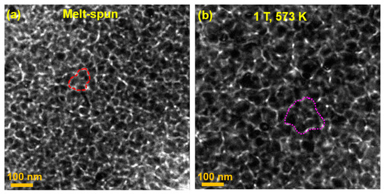 It is worth noting that the underlying magnetic mechanism of improved magnetic properties by magnetic field annealing in the Nd-La and Nd-Ce alloys is different. In the Nd-La alloy, no intergranular phase is observed. The Br of the Nd-La alloy is increased after magnetic field annealing due to the enhancement of the exchange coupling interaction between adjacent grains. It is confirmed by the magnetic domain structure, as shown in the Fresnel images taken by the Lorentz microscope in Figure 5. The magnetic domain size of the melt-spun alloy (marked by a red dashed line) in Figure 5a is 88 nm, which is larger than the average grain size of 26 nm. It indicates that an interaction domain is formed, which features a magnetic domain containing several grains [51]. The interaction domain is also observed in the magnetic field-annealed alloy, which is marked by a pink dotted line in Figure 5b. Moreover, the domain size of the annealed alloy is 266 nm, which is larger than 88 nm of the melt-spun alloy. It suggests that a stronger exchange coupling interaction is present in the magnetic field-annealed alloy, leading to the improvement in magnetic properties. Hence, the Br and (BH)max of the magnetic field-annealed Nd-La alloy are increased to 0.86 T and 124 kJ/m3 when compared to the Br (0.84 T) and (BH)max (117 kJ/m3) of the melt-spun alloy.