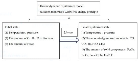 Schematic diagram of the thermodynamic equilibrium model for direct reaction between biomass and iron oxides based on the minimum free energy method.