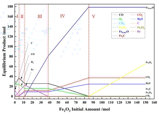 Figure 2 shows the relationship between the Fe2O3 initial amount and the amount of equilibrium products for the pine sawdust and iron oxide reduction system at 900 °C and 101,325 Pa. According to the trend of the product type and the amount of the material, the reduction process can be divided into five stages in sequence. In these conditions, no Fe3O4 and Fe3C appeared.