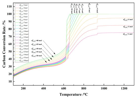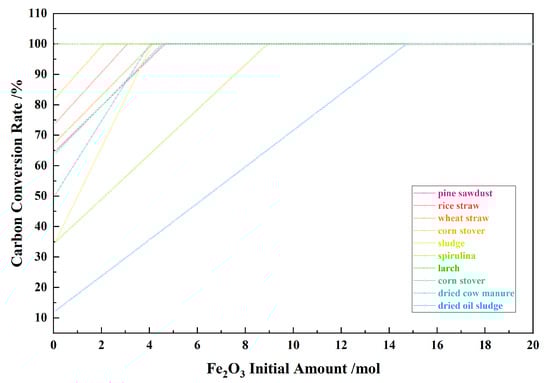 Figure 15 shows the relationship between the temperature and the carbon conversion rate in the 1 kg of pine sawdust and iron oxide reduction system at 100–1300 °C and 101,325 Pa. With the temperature increasing, the carbon conversion rate increased to the maximum and remained unchanged. When the Fe2O3 initial amount was ≥4 mol, the maximum carbon conversion rate was 100%. As the Fe2O3 initial amount decreased from 3 mol, the maximum carbon conversion rate decreased to <100%.