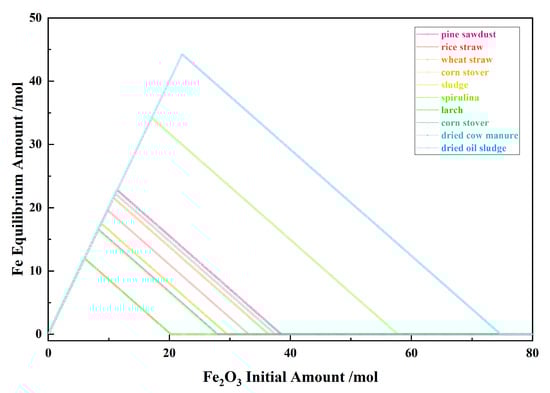Figure 4 shows the relationship between the Fe2O3 initial amount and the Fe equilibrium amount for the 10 types of biomasses and iron oxide reduction system at 900 °C and 101,325 Pa. With the Fe2O3 initial amount increasing, the Fe equilibrium amount increased to the maximum from the I to II stages and decreased to zero in the III stage.