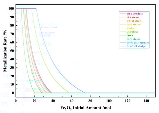 Figure 5 shows the relationship between the Fe2O3 initial amount and the metallization rate for the 10 types of biomasses and iron oxide reduction system at 900 °C and 101,325 Pa. With the Fe2O3 initial amount increasing, the metallization rate remained at 100% in the I–II stages, and decreased to zero in the III stage.