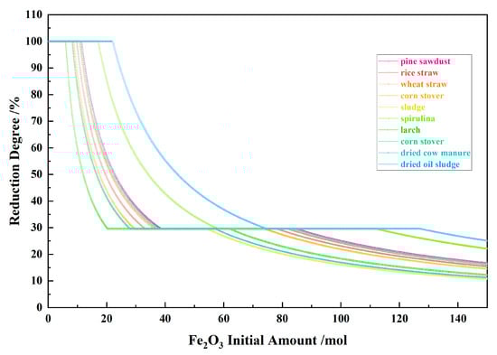 Figure 6 shows the relationship between the Fe2O3 initial amount and the reduction degree for the 10 types of biomasses and iron oxide reduction system at 900 °C and 101,325 Pa. With the Fe2O3 initial amount increasing, the Fe equilibrium amount increased to the maximum from the I to II stages and decreased to zero in the III stage.