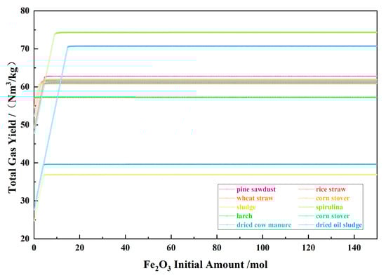 The effect of the Fe2O3 initial amount on the total gas yield in the biomass and iron oxide reduction system at 900 °C and 101,325 Pa.