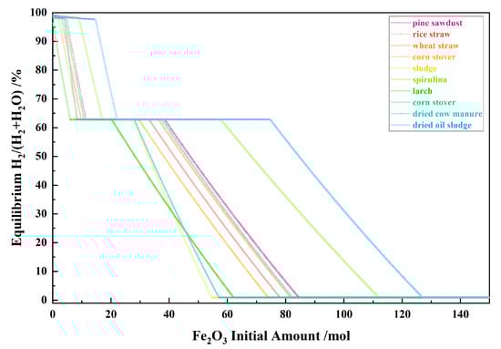 The effect of the Fe2O3 initial amount on the equilibrium H2/(H2 + H2O) in the biomass and iron oxide reduction system at 900 °C and 101,325 Pa.