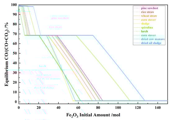 The effect of the Fe2O3 initial amount on the equilibrium CO/(CO + CO2) in the biomass and iron oxide reduction system at 900 °C and 101,325 Pa.