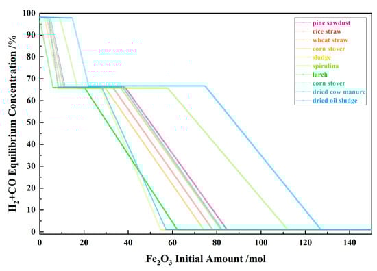 Figure 10 shows the relationship between the Fe2O3 initial amount and the H2 + CO equilibrium concentration for the 10 types of biomasses and iron oxide reduction system at 900 °C and 101,325 Pa. With the Fe2O3 initial amount increasing, the H2 + CO equilibrium concentration decreased in the I, II and IV stages and remained unchanged and consistent in the III and V stage.