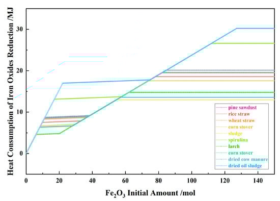 Based on Table 1, Formula (16), and Table 5, the maximum amount of Fe2O3 that can be reduced by 10 types of biomasses was calculated and is shown in Table 6. As the temperature increases, the maximum amount of reduced Fe2O3 showed a decreasing trend. The maximum amount of reduced Fe2O3 varied greatly under the same temperature conditions.