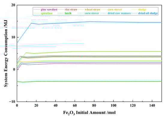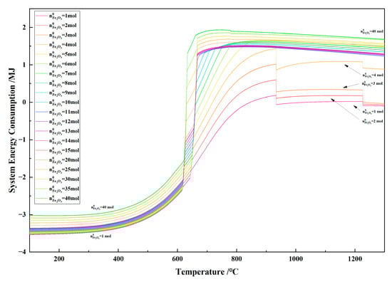 Figure 26 shows the relationship between the temperature and the system energy consumption in the 1 kg of pine sawdust and iron oxide reduction system at 100–1300 °C and 101,325 Pa. With the temperature increasing, the curves of the system heat consumption approximated an S shape. When the initial Fe2O3 amount was 1–4 mol, the system heat consumption dropped sharply at 900 °C and 1227 °C. The system heat consumption exhibited a certain degree of parallelism and increased with the increase in the amount of iron oxide from 4 mol to 40 mol.