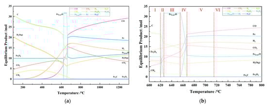 From Figure 14a, it can be seen that as the temperature increases from 100 °C to 1300 °C, the composition and quantity of equilibrium substances constantly change. Especially within the narrow temperature range of 620–718 °C, the changes are more complex, as shown in Figure 14b. Each stage is separated by a red dashed line in the Figure 14b and labeled with numerical symbols from I to VI. According to the phase change of the iron element, the temperature-dependent process in Figure 14b can be divided into six stages, as shown in Table 4. As the temperature increases, the reduction in iron follows a step-by-step reduction pattern at 100–718 °C: Fe2O3 → Fe3O4 → Fe0.947O → Fe. Within the temperature range of 718–1300 °C, as the temperature increases, there is a slow decrease in the amount of product Fe and a slow increase in the amount of product Fe0.947O. This is because within this range, the ratio of carbon monoxide to hydrogen in the system is ≥1.33, and the reduction ability of the mixed gas is similar to that of CO and decreases with increasing temperature.