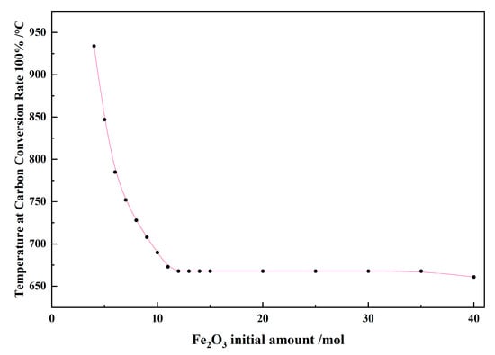 The effect of the Fe2O3 initial amount on the temperature at a carbon conversion rate of 100% in the 1 kg of pine sawdust and iron oxide reduction system at 100–1300 °C and 101,325 Pa.