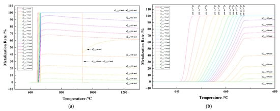 Figure 17 shows the relationship between the temperature and the metallization rate in the 1 kg of pine sawdust and iron oxide reduction system at 101,325 Pa and at 600–1300 °C (a) and 630–680 °C (b). With the temperature increasing from 640 °C to 670 °C, the metallization rate reached the maximum. The metallization rate remained at 100% as the Fe2O3 initial amount was 5–11 mol and the temperature was >670 °C. The maximum metallization rate decreased from 100% to zero as the Fe2O3 initial amount increased from 11 mol to 40 mol.