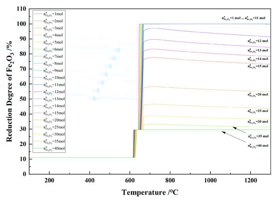 Figure 18 shows the relationship between the temperature and the degree of reduction in the 1 kg of pine sawdust and iron oxide reduction system at 600–1300 °C and 101,325 Pa. With the temperature increasing, the reduction degree of Fe2O3 reached 100% as the Fe2O3 initial amount was 1–11 mol, and the maximum reduction degree of Fe2O3 decreased to 29.60% as the Fe2O3 initial amount increased from 11 mol to 40 mol.