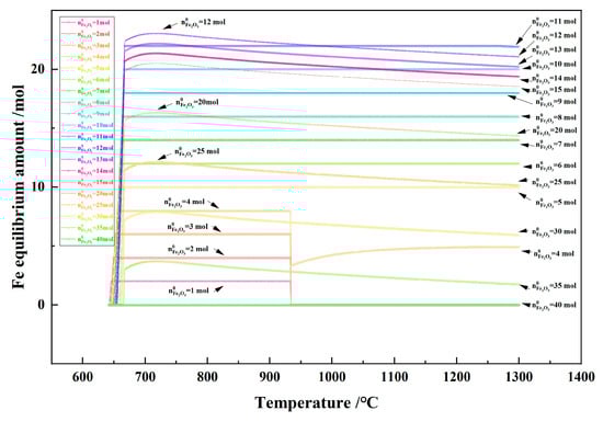 Figure 19 shows the relationship between the temperature and the Fe equilibrium amount in the 1 kg of pine sawdust and iron oxide reduction system at 600–1300 °C and 101,325 Pa. The maximum production of metallic Fe occurred when the Fe2O3 initial amount was 12 mol and the temperature was 718 °C, reaching 23.05 mol. The maximum production of metallic Fe remained unchanged when the Fe2O3 initial amount was 5–11 mol and the temperature was >670 °C, and decreased with the temperature increase from 670 °C to 1300 °C, when the Fe2O3 initial amount was 12–35 mol.