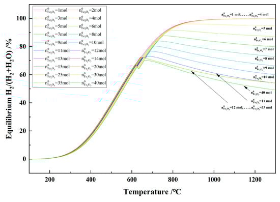 Figure 20 shows the relationship between the temperature and the equilibrium H2/(H2 + H2O) in the 1 kg of pine sawdust and iron oxide reduction system at 100–1300 °C and 101,325 Pa. With the temperature increasing, the equilibrium H2/(H2 + H2O) shows a trend of first increasing and then decreasing as there is no carbon present in the system. When the initial Fe2O3 amount was 12–35 mol and temperature ≥ 666 °C, the equilibrium H2/(H2 + H2O) curves showed coincidence and consistency.