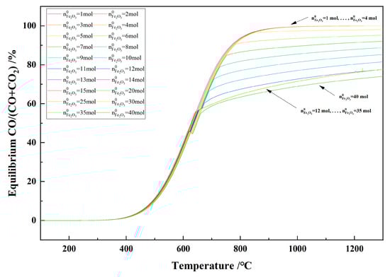 Figure 21 shows the relationship between the temperature and the equilibrium CO/(CO + CO2) in the 1 kg of pine sawdust and iron oxide reduction system at 100–1300 °C and 101,325 Pa. With the temperature increasing, the equilibrium CO/(CO + CO2) increased quickly initially and then slowed down. When the initial Fe2O3 amount was 12–35 mol and the temperature was ≥666 °C, the equilibrium CO/(CO + CO2) curves showed coincidence and consistency.